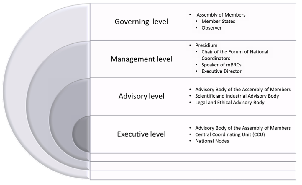The governance structure envisages an organisational structure with four levels in which the different tasks of (1) Assembly of Members (Member State representatives), the decision making body; (2) the Executive Director of the MIRRI-ERIC and CCU staff; (3) the MIRRI National Node coordinators; and (4) the directors of national mBRCs are realized. Advisory Boards and representatives of the user community constitute additional bodies.