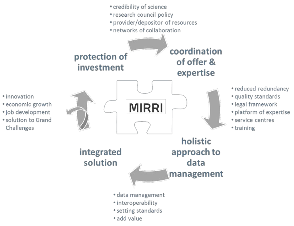 Connection of strain data to other relevant data sets to facilitate the generation of knowledge is one of the main missions of MIRRI, following the principles laid down in the report Riding the wave explaining How Europe can gain from the rising tide of scientific data [16] where the benefits of accelerating the development of a fully functional e-infrastructure for scientific data is described. Delivery of high-quality microbial resources with facilities to data mine associated data sets will facilitate research and accelerate the discovery of new products and stimulate innovative microbial solutions to the Grand Challenges. MIRRI will facilitate this by ensuring interoperability between microbial strain data and other relevant data sets such as DNA and protein sequences, ecological data, metabolites, geographical data and phylogenetic relationships. MIRRI will deliver a coordinated accession policy to broaden coverage of resources, increase capacity to store and deliver more characterised microorganisms to researchers. MIRRI will seek data holding partners and, through ELIXIR and BioMedBridges initiatives, will ensure interoperability of its community data to facilitate accelerated discovery and innovation, and interaction with other regional networks.