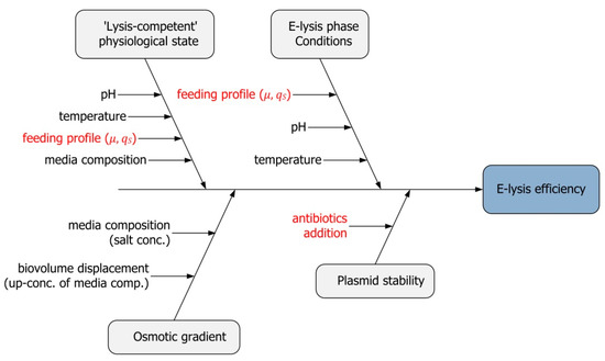 To follow a science-based approach, all critical parameters having potential negative effects on the overall lysis efficiency (LE) had to be identified, both during fed-batch phase (b) as well as during E-lysis phase (c). This was done in a classical risk assessment using a cause-and-effect (Ishikawa) diagram with the focus on LE as a critical quality attribute. All potential critical process parameters are included and rated due to their potential criticality, as shown in Figure 1. Parameters of high criticality are marked in red in the diagram and were selected for further characterization studies.