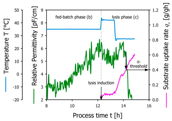 Figure 2 shows the course of the experiment beginning with the fed-batch phase (b). The values for qS (c) were calculated in retrospect from the feed flow rate based on the assumption that the change in biomass concentration was negligible in the early stage of phase (c). This assumption is supported by the fact that the permittivity signal stagnates after LI before a significant drop indicated the onset of E-lysis at ~14.25 h process time. From that, we concluded that the minimum value for qS (c) in order to see the first indicators for E-lysis is approximately 0.4 g/gh. Since qS (c) is calculated as a function of the feed flow rate and the biomass concentration at the end of the fed-batch phase (b), the values depicted in Figure 2 after E-lysis onset represent qS (c) based on the feed-forward approach as described above.