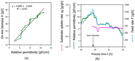A fermentation run with EcN (pGLysivb) was conducted to demonstrate the applicability of the capacitance-controlled feeding strategy using the 20 L bioreactor setup as described above. The permittivity signal recorded during fed-batch phase was correlated with the output of the soft-sensor in the fed-batch phase establishing the transfer function X = f (Δε) as mentioned above. Figure 4a shows the correlation of online biomass data from the soft-sensor with the in-line permittivity signal (b(0) = −2.564, b(1) = 4.094, R2 = 0.93). At the point of lysis induction (indicated by the arrow in Figure 4b, the feed-forward controller for the exponential flow rate was turned off and the permittivity-based feed rate control was implemented. Figure 4b shows that the feed rate implemented by the permittivity-driven control strategy closely follows the course of the permittivity and also that the specific substrate rate qS (c) could be maintained at a constant average level of 0.92 g/gh over the whole E-lysis phase (c).