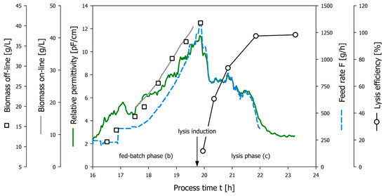 Figure 5 summarizes the relevant process phases to demonstrate the successful implementation of the permittivity based feed-rate control for the production of BGs. The batch phase yielded a biomass concentration X = 8.3 g/L at which a feed-forward fed-batch was started by setting the feeding profile to a target specific substrate uptake rate qS (b) = 0.6 g/gh. Biomass propagation is followed by dielectric spectroscopy measuring the permittivity, offline biomass sampling and a soft-sensor predicting the viable biomass as described above. Offline biomass samples were taken at thirty-minute intervals to retrospectively validate the biomass estimation by the soft-sensor. Good correlation between online and offline biomass measures as well as linear proportionality between permittivity signal and viable biomass (see also Figure 4b) was demonstrated during the fed-batch phase. Following the accumulation of 40 g/L biomass, the temperature was increased to 42 °C to open the temperature inducible promoter for E-lysis, and the permittivity based feed-rate control was started. The sudden drop in permittivity indicating the loss of membrane potential due to E-lysis is in good agreement with the at-line FCM data, showing increasing lysis efficiency with a final LE = 98.3% at the end of E-lysis phase (c).