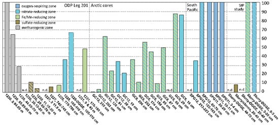 Bar diagram showing percentages of Marine Group I (MG-I) representation in archaeal 16S rRNA gene clone libraries, denaturant gradient gel electrophoresis (DGGE) and pyrosequencing profiles for marine sediment core samples, color-coded by electron acceptor availability. Color stripes indicate evidence for coexisting electron acceptors or pathways, or ambiguity in the data. Ocean Drilling Program (ODP) site numbers represent Equatorial Pacific Site 1225 [this study], Peru Margin Site 1227 [11], Peru Basin Site 1231 [3], and Peru Trench Site 1230 [11]. Arctic Ocean cores GC12 and GC6 from sediment cores near the hydrothermally active Gakkel Ridge were analyzed by 16S rRNA gene pyrosequencing [6]. SPG11 and SPG12 refer to South Pacific Gyre core SPG11 and South Pacific core SPG12 [4,5]. DGGE slurry data refer to DGGE results from stable carbon isotope probing experiments with sediments from the Severn Estuary, UK [48]. n.d., not detected; m.d., missing data. Data underlying this bar diagram are compiled in Table S1.