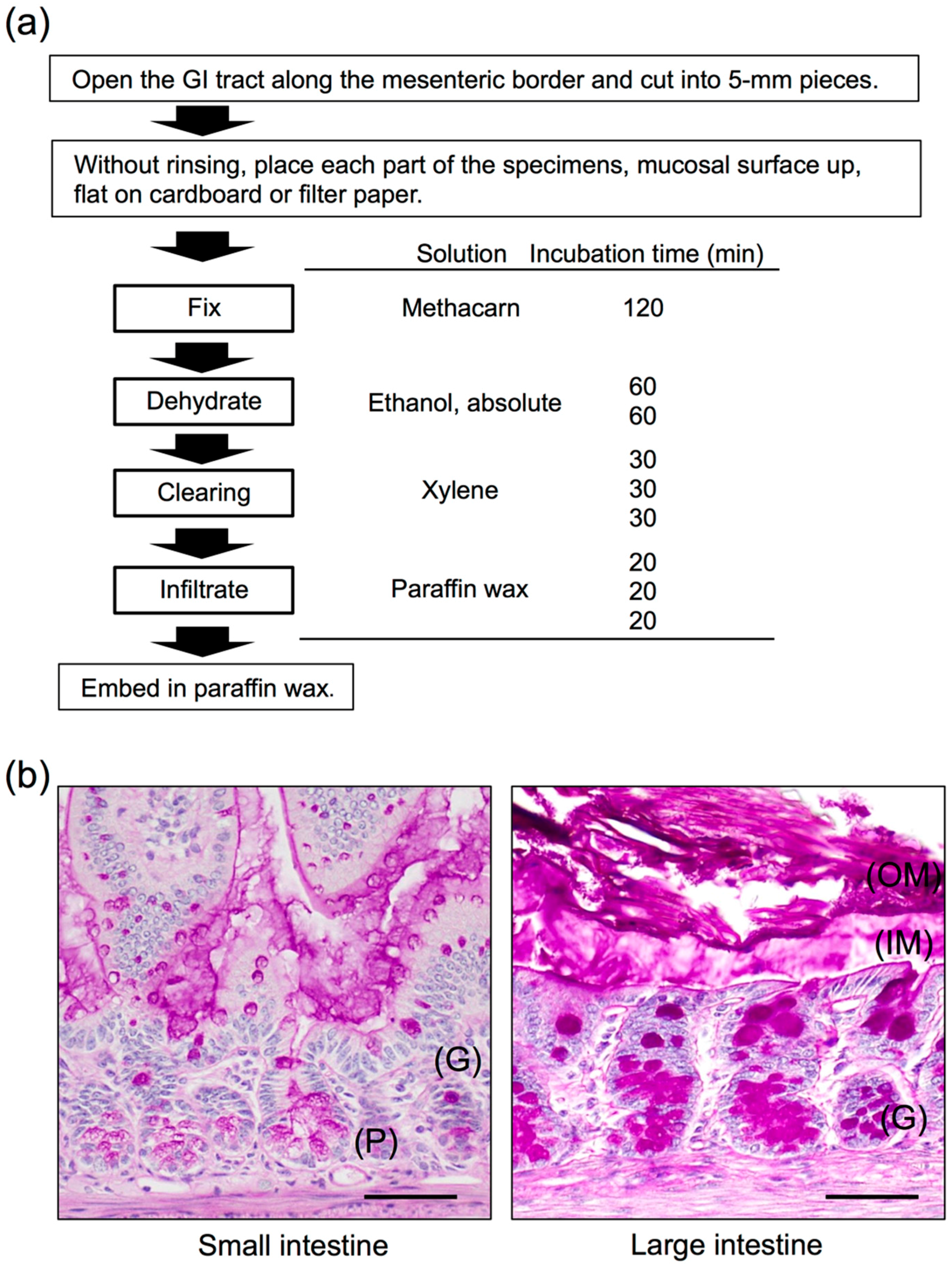 Histology of the mouse small and large intestines. (a) Methacarn fixative and paraffin embedding procedure and methods, based on Puchtler’s protocol [41]. (b) Transverse sections of a 12-week-old male mouse small intestine (jejunum) and large intestine (colon). Methacarn fixative, periodic acid-Schiff stain. OM, outer mucus; IM, inner mucus; G, goblet cells; P, Paneth cells. Scale bars: 100 µm. Based on the results of Nishiyama et al. [47].