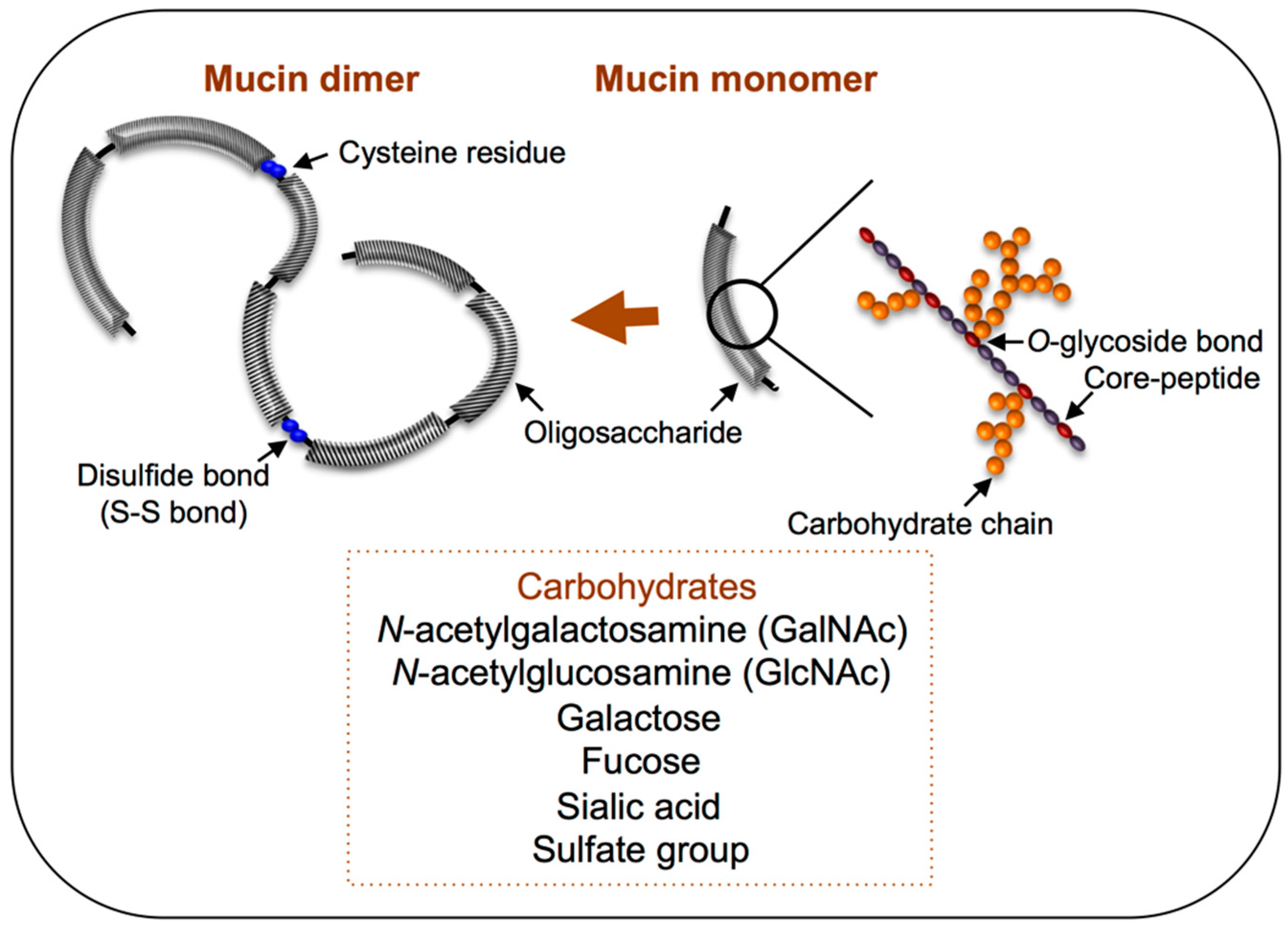 Mucin secretion is an extremely dynamic process, and new mucin is continuously produced in colonic goblet cells and features a turnover rate of <1 h [43]. The gene muc encodes the core protein of mucin, and approximately 20 different mucin-encoding genes have been discovered in humans to date, and a few homologous muc genes have been identified in other animal species [23,34]. Among the secreted mucins, the main gel-forming molecules are MUC2, MUC5AC, MUC5B, and MUC6 [45], and MUC2 is the predominant mucin in the small and large intestines [46]. As illustrated in Figure 3, the molecular structure of MUC2 mucin has been likened to a “bottle-brush”. Mucin-type O-glycans are covalently α-linked via an N-acetylgalactosamine (GalNAc) moiety to the hydroxyl group of serine or threonine residues within a peptide backbone (Figure 3). The transfer process of the glycosylation reaction occurs in the Golgi apparatus, starting with the addition of GalNAc, following which various carbohydrate chains are formed through the addition of galactose, N-acetylglucosamine (GlcNAc), fucose, or sialic acid, depending on the glycosyltransferase prevalence in the cell. In certain cases, sulfotransferases also add a sulfate group. After the carbohydrate chains have been added in the Golgi apparatus and the molecule is secreted, disulfide bonds form between all of the monomers at their N-terminal cysteine residues, which results in the assembly of a single giant polymer (Figure 3). Moreover, the human ABO blood-group substance is frequently expressed on the non-reducing terminal of the mucin glycan, which generates carbohydrate chains featuring diverse structures [46].