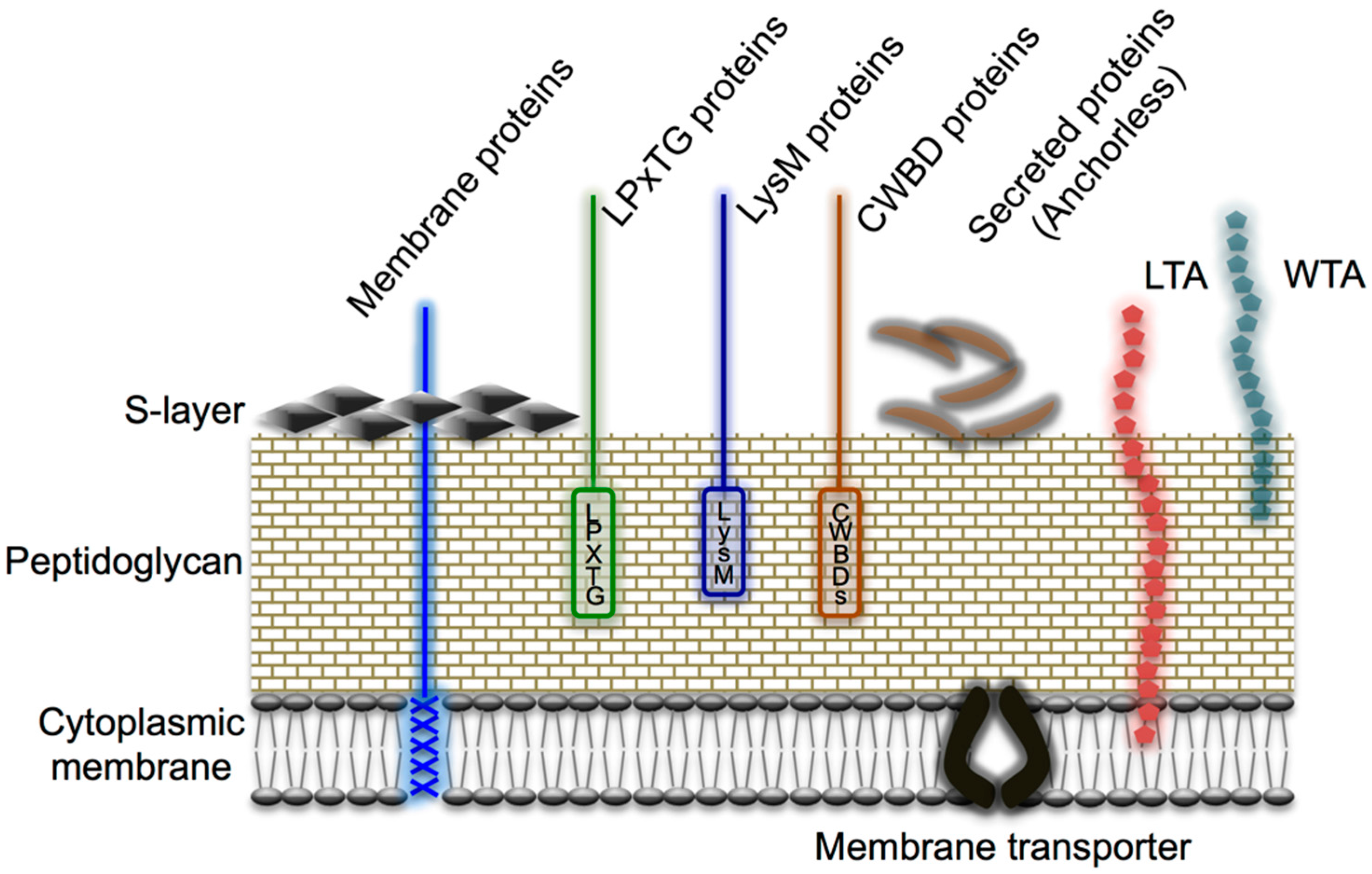Cell-surface architecture of Gram-positive bacteria. A thick, multilayered peptidoglycan layer is decorated with lipoteichoic acid (LTA), wall teichoic acid (WTA), and various proteins, including S-layer proteins. Cell wall-anchored proteins are attached to the cell wall either (i) covalently by sortases (e.g., LPXTG proteins) or (ii) non-covalently (e.g., through a LysM motif or cell wall-binding domains [CWBDs]). Membrane proteins can covalently attach to the long-chain fatty acids of the cytoplasmic membrane, whereas S-layer proteins are attached to the cell wall through charged or uncharged secondary cell wall polymers. Reproduced from Desvaux et al. [67] with several modifications.