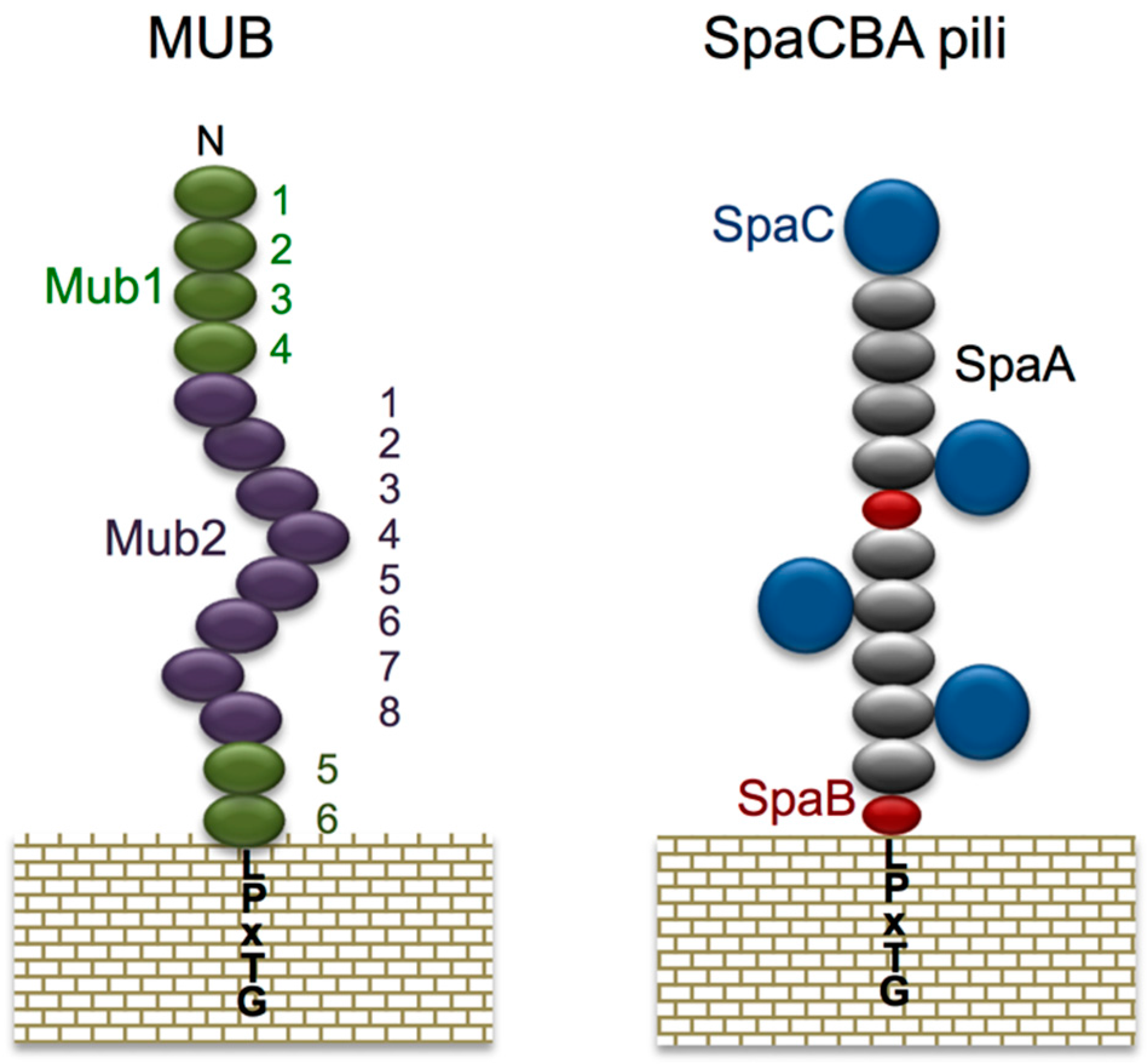 Schematic model of MUB and SpaCBA pili. MUB comprises 6 Mub1 repeats (green) and 8 Mub2 repeats (purple). The C-terminal LPXTG motif anchors MUB to the peptidoglycan of the bacterial cell wall. Reproduced from Roos and Jonsson [68] and Etzold et al. [70] with several modifications. The heterotrimeric SpaCBA pili are composed of shaft-forming SpaA (gray) major pilins together with SpaB (red) and SpaC (navy) minor pilins. Reproduced from Kankainen et al. [76] and Reunanen et al. [77] with several modifications.