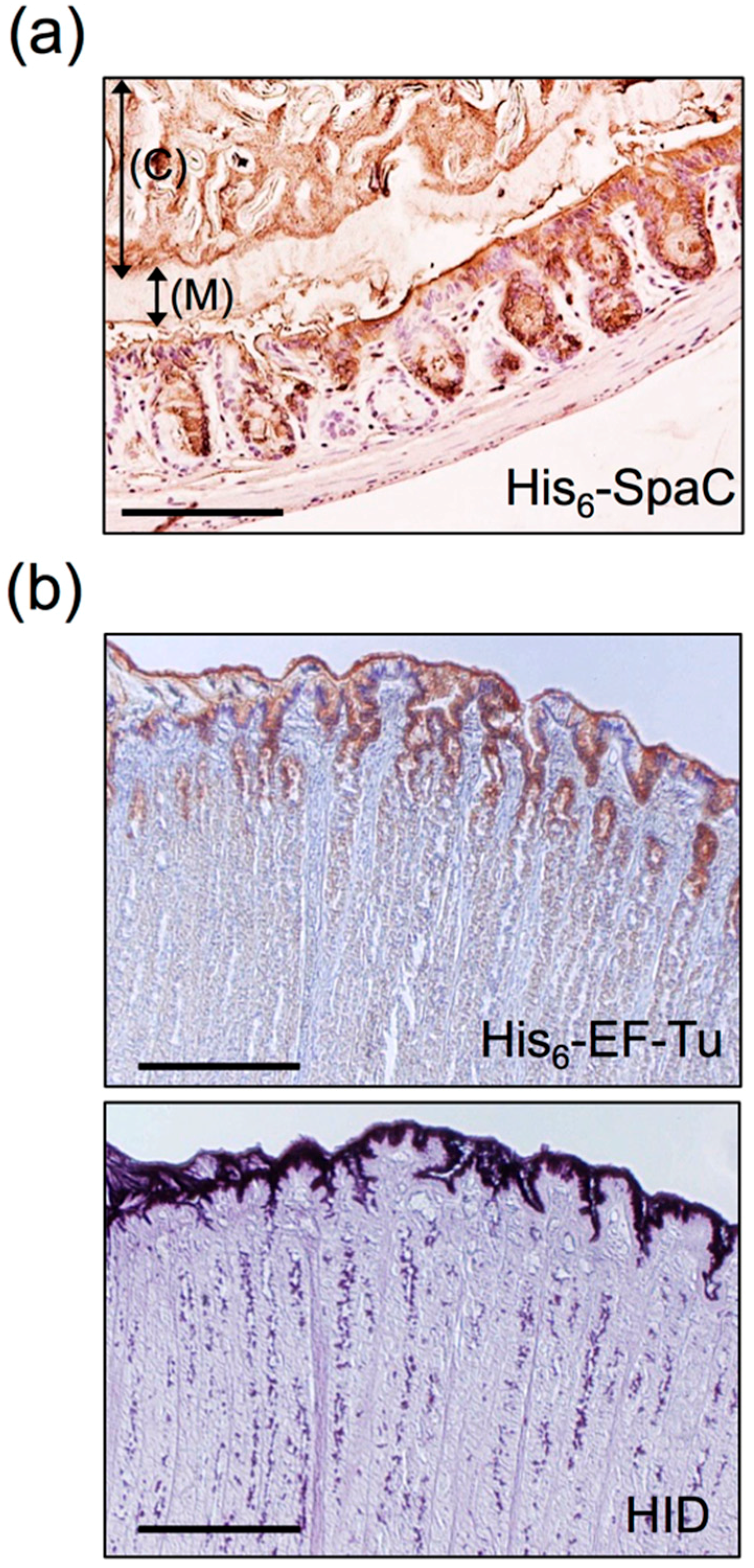 Histochemical staining of the Methacarn-fixed GI mucosal surface with recombinant proteins. (a) Binding of His6-SpaC was observed on the murine colonic mucosa. Arrows indicate the gut contents (C) and the mucus layer (M). Scale bar: 200 µm. Based on the results of Nishiyama et al. [47]. (b) Binding of His6-EF-Tu was observed on the porcine gastric mucosal surface (upper panel). These areas were coincident with areas positively stained for high iron diamine (HID) (lower panel). Scale bars: 1000 µm. Based on the results of Nishiyama et al. [86].