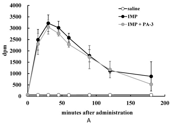Radioactivity was significantly lower in the blood of rats 60 min after administration of 14C-IMP plus PA-3 than after administration of 14C-IMP alone (Figure 4A). Similarly, the blood of rats administered 14C-inosine plus PA-3 showed significantly lower radioactivity after 15, 30, and 45 min than the blood of rats administered 14C-inosine alone (Figure 4B), and the blood of rats administered 14C-hypoxanthine plus PA-3 showed significantly lower radioactivity after at 15, 30, 45, 60, and 90 min than the blood of rats administered 14C-hypoxanthine alone (Figure 4C).