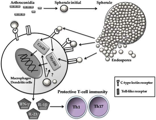 Host immune cells respond to parasitic cells of Coccidioides. Spherules and endospores are recognized by C-type lectin receptors and Toll-like receptors expressed on innate cell types to initiate a signal cascade via activating intracellular immune adaptors (i.e., Card9 and Myd88). Subsequently, the activated innate cells produce pro-inflammatory cytokines such as interferon-γ (FN-γ), interleukin (IL)-23 and IL-1β, which, in turn, guide the development and differentiation of Th1 and Th17 cells.