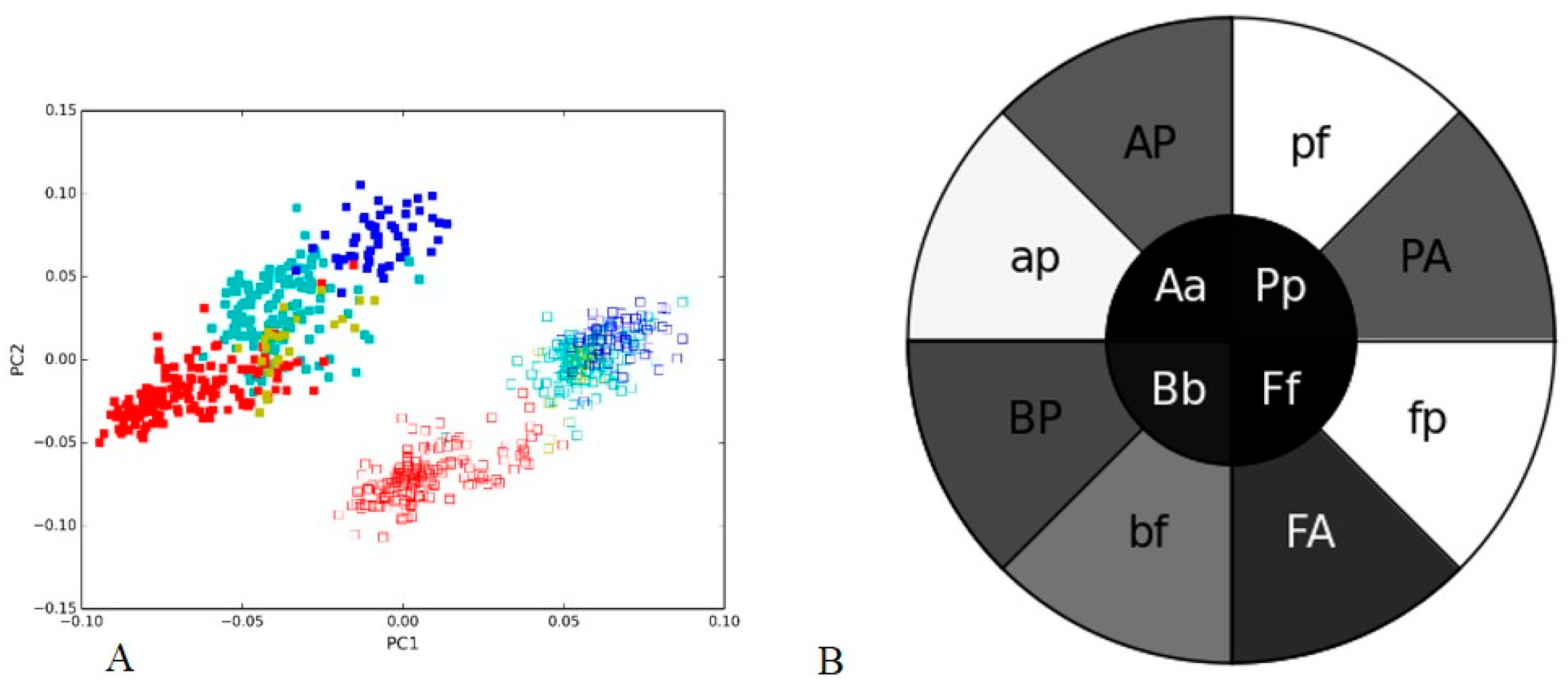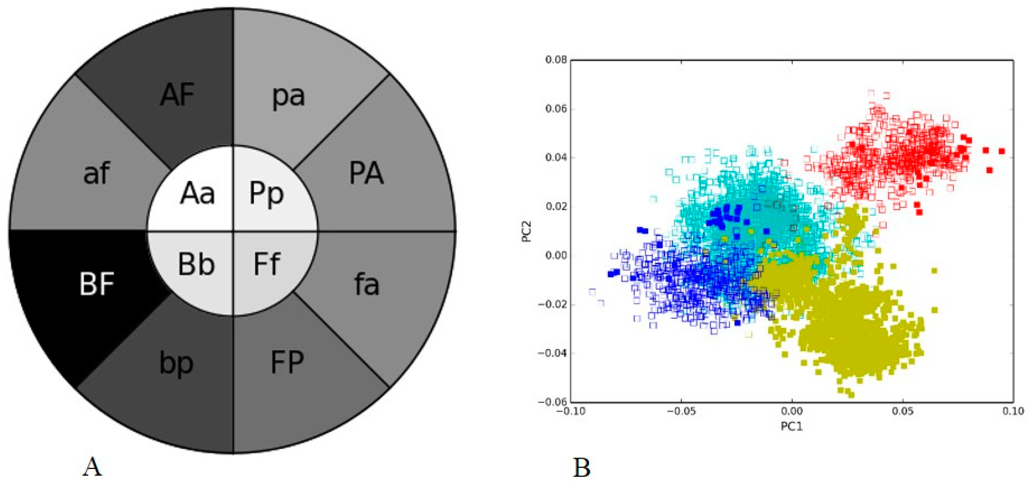 We then investigated the effectiveness of clustering in PCA analysis using our PGHM methodology for the two samples. We calculated the mean Pearson’s correlation coefficient for all possible pairs of sequences within each cluster and between the clusters, as detailed in the Methods. These means were then converted into different shades of gray, with darker shade corresponding to a lower (between 0 and 0.11 in this case) and lighter shade to a higher correlation coefficient (between 0.71 and 1), respectively, and plotted them in a concentric heatmap (Figure 1B).