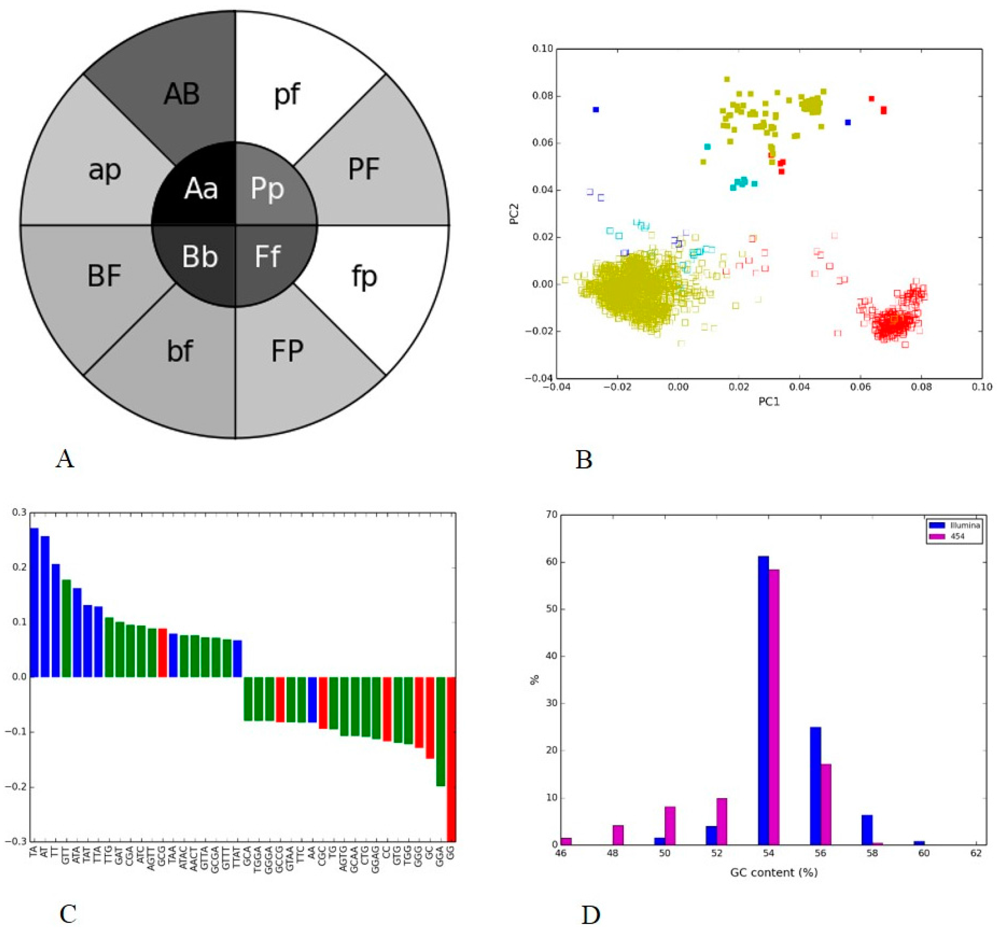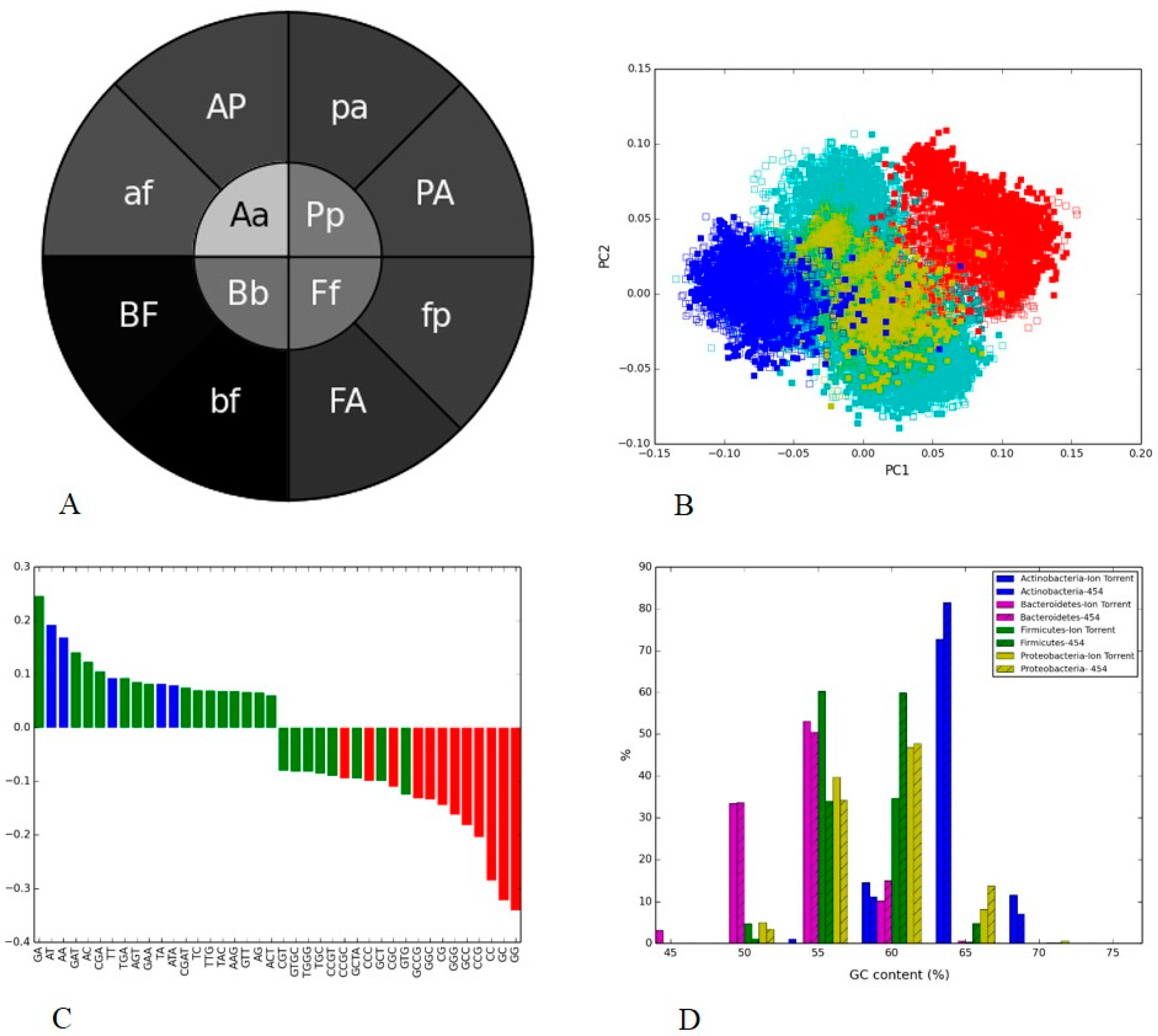 We observed that the sample/platform separation was very clearly provided by PC2 and some species separation—by PC1. One word, “GG”, provided the largest contribution to the PC1, and its frequency distribution pattern played a role in differentiating phylogenies on both platforms. Figure 4B showed clusters of 454 (except Bacteroidetes) were <0 on the PC1 axis, and negative axis in Figure 4C was dominated by GC-rich (red bars) nucleotide words. This indicated that the two technologies clearly differ in their ability to capture sequences with different GC content, with “GG” being the main contributor to this difference.