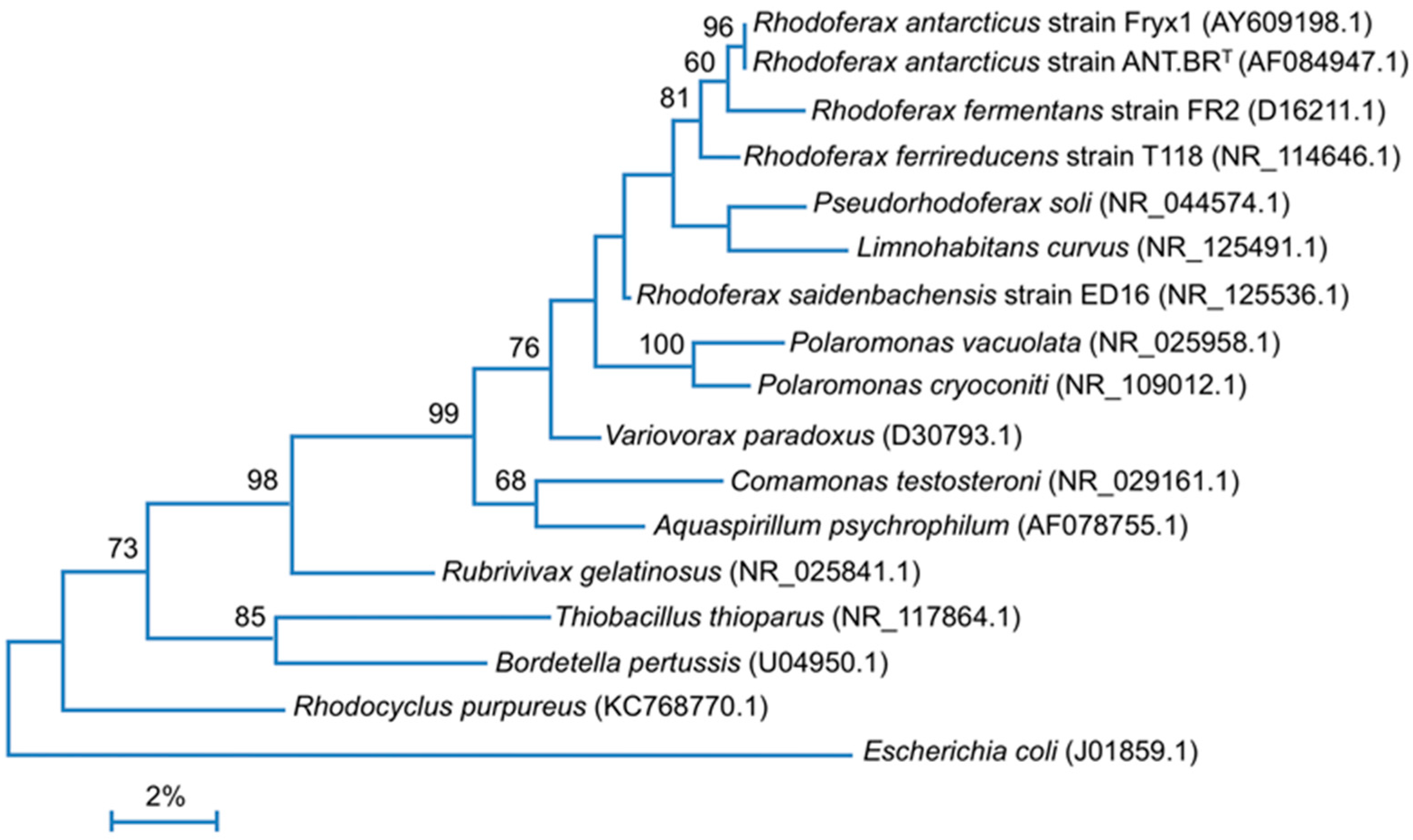 - Madigan, M.T.; Jung, D.O.; Woese, C.R.; Achenbach, L.A. Rhodoferax antarcticus sp. nov., a moderately psychrophilic purple nonsulfur bacterium isolated from an Antarctic microbial mat. Arch. Microbiol. 2000, 173, 269–277. [Google Scholar] [CrossRef] [PubMed]