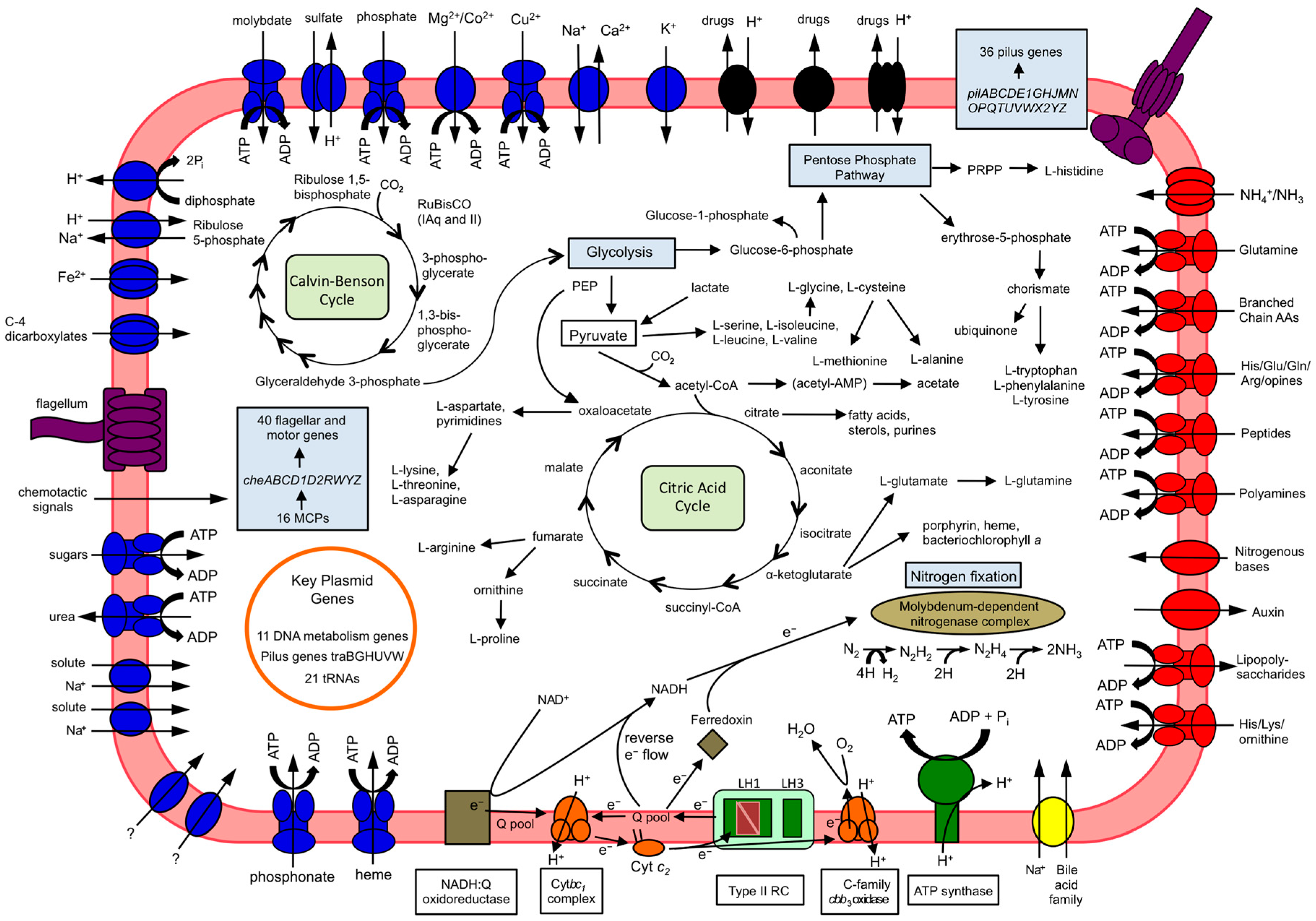 Summary of metabolism and transporters of Rfx. antarcticus ANT.BRT. Noteworthy features include light-harvesting via a type II (quinone-type) reaction center [25] in association with LH1 and LH3, an intact Calvin–Benson cycle with two forms of RuBisCO, the ability to synthesize 20 amino acids, and antibiotic resistance properties conferred by drug exporters. In addition, both a flagellum and a type IV pilus are shown, providing two means of motility. Interestingly, although biotin is required for growth, no biotin transporter was identified in the genome. However, it is possible that a novel biotin transporter is present among several transporters of undetermined substrates.