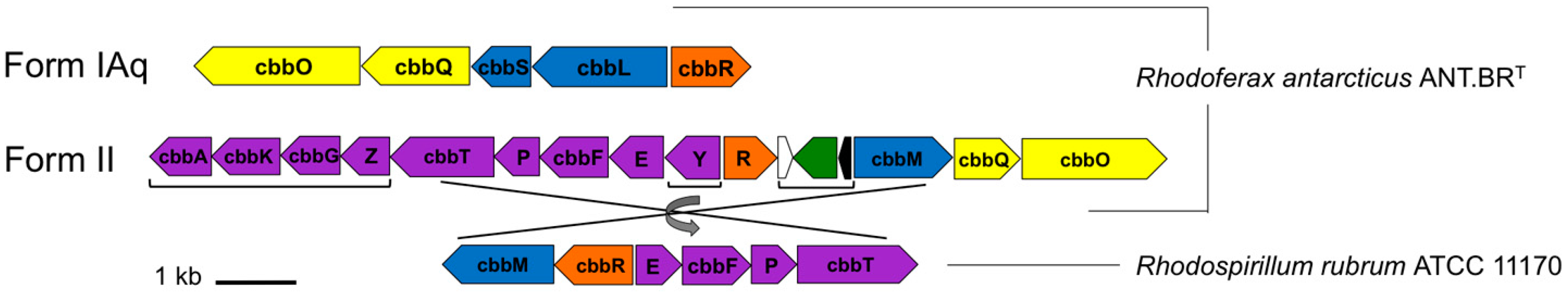 - Badger, M.R.; Bek, E.J. Multiple Rubisco forms in proteobacteria: Their functional significance in relation to CO2 acquisition by the CBB cycle. J. Exp. Bot. 2008, 59, 1525–1541. [Google Scholar] [CrossRef] [PubMed]