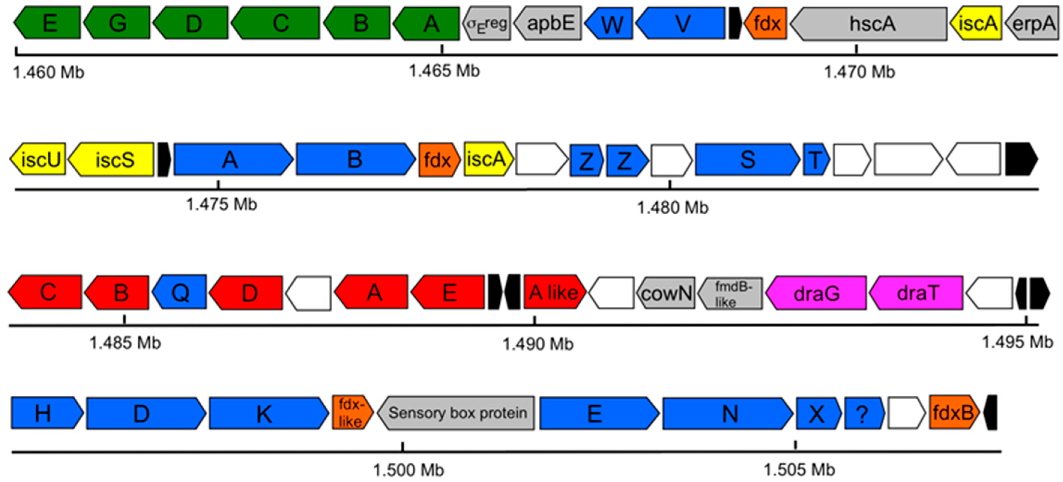 All nif genes absolutely required for nitrogen fixation [44] were present in the Rfx. antarcticus genome, but there were some notable absences from the canonical nitrogen fixation cluster. Although nifJ, which encodes pyruvate flavodoxin/ferredoxin oxidoreductase, is missing from the Rfx. antarcticus nitrogen fixation gene cluster, a gene was identified that is predicted to encode a pyruvate flavodoxin/ferredoxin oxidoreductase (GRFA_1003; EC 1.2.7.1) at approximately 0.9 Mb, adjacent to other electron transfer genes. This suggests that this gene product could serve the function of NifJ. Additionally, while no strong matches for flavodoxin were found in the Rfx. antarcticus genome, four different ferredoxin genes are located in the nitrogen fixation cluster, suggesting that ferredoxin, not flavodoxin (nifF-encoded or otherwise), may be used by this phototroph to shuttle electrons from the electron transport chain to the nifH-encoded Fe protein of the nitrogenase complex [45]. Other nif genes missing from the Rfx. antarcticus genome include nifU (scaffold protein associated with nifS activity), nifM (Fe protein processing), nifY (insertion of FeMo-cofactor into dinitrogenase), and nifL (negative regulator of the nif genes) [45,46,47]. The composition of nif gene clusters varies greatly among species, depending upon the presence or absence of other proteins that can substitute for nif gene products [47,48]. For example, both iscU (GRFA_1626), a homolog of nifU, and two copies of iscA (GRFA_1624 and GRFA_2967), which have been postulated to be an alternate scaffold to NifU for the construction of Fe-S clusters [49,50], are present in the Rfx. antarcticus nitrogen fixation cluster. The significance of these would require further study.