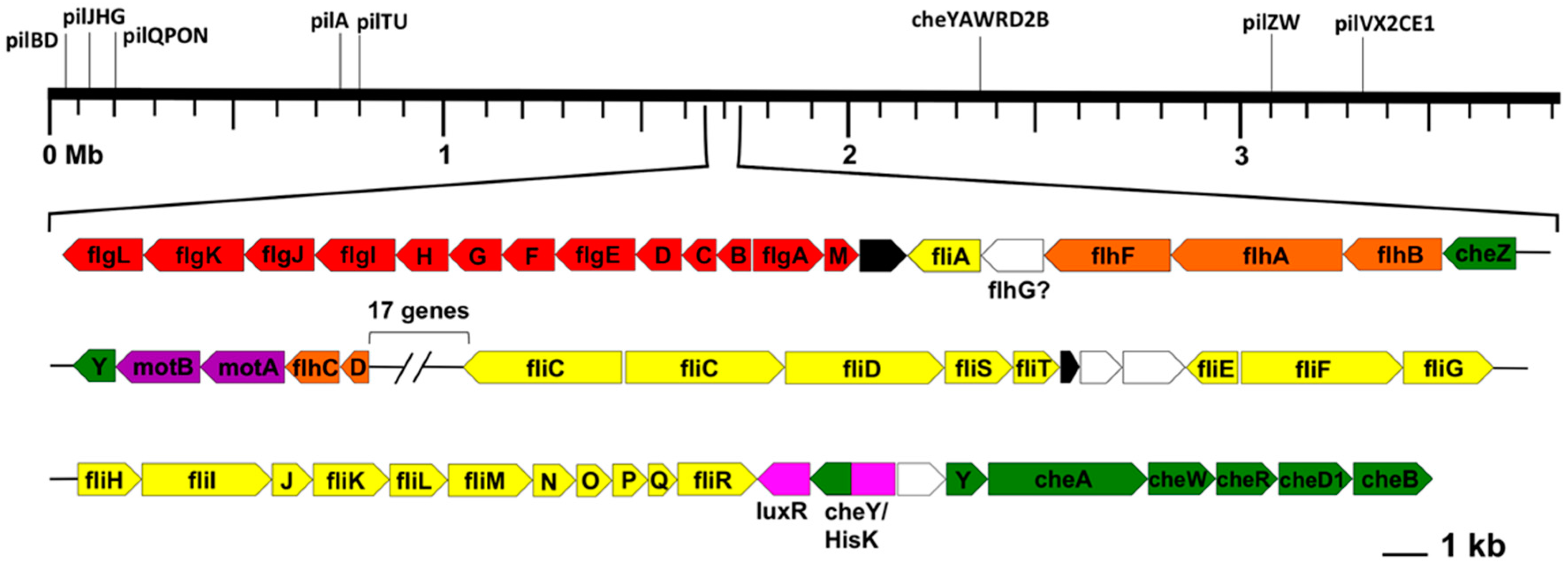 Linear representation of the Rfx. antarcticus chromosome, loci of motility genes, and expanded flagellar gene cluster. Type IV pilus genes and a second set of chemotaxis genes (black lines) are distributed down the length of the chromosome, but the flagellar genes are all located in one superoperonal gene cluster. Color key: red, flg gene cluster; yellow, fli gene cluster; orange, flh gene cluster; green, che gene cluster; purple, mot gene cluster; pink, unrelated characterized proteins; white, uncharacterized proteins; black, hypothetical proteins.