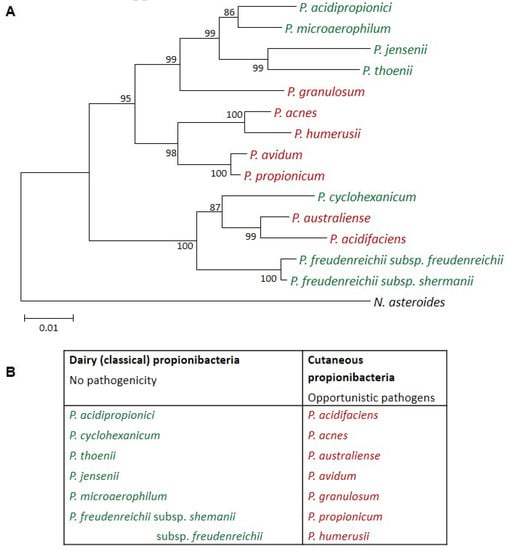 (A) Propionibacteria minimum evolution phylogenetic tree based on 16S rDNA sequences. The 16S rDNA sequence of the Actinomycetale Nocardia asteroides was used as a distant outgroup to root the tree. Adapted from McDowell et al. [2]; (B) Repartition of Propionibacterium species in two distinct groups. The species formerly known as P. inoccuum and P. lymphophilum have been reclassified as Propioniferax innocua and Propionimicrobium lymphophilum respectively. P. freudenreichii received the GRAS (generally recognized as safe) status. Adapted from Cousin et al. [5]. Dairy species are presented in green and cutaneous ones in red.