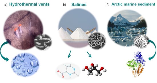 Example of extreme aquatic habitats and the extremophiles and the molecules they produce. (a) Hydrothermal vents: The hyperthermophilic Thermotoga neapolitana, a hydrogen-producing bacterium isolated at “Secca Fumosa” in the Gulf of Pozzuoli, Naples, Italy. (b) Salines: The halophilic Chromohalobacter salexigens, a bacterium isolated at the island of Bonaire, Netherlands Antilles. The osmoadaptation is achieved by the accumulation of several types of osmolytes such as ectoine and glycerols. (c) Arctic marine sediment: The marine psycrophile Colwellia psychrerythraea, producing a cold-active aminopeptidase (ColAP), isolated from Arctic marine sediments.