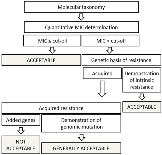 Individual strains of FC always need to be phenotypically assessed for susceptibility to clinically relevant antibiotics. Individual strains of FC as such are not pathogenic and thus do not need to be treated with antibiotics, but since they are alive when ingested in high numbers by the individual eating the food, they should not have antibiotic resistance genes that can be transferred to other (pathogenic) microorganisms in the gut and thereby making the curing of pathogens more difficult. Antibiotic resistance levels and the presence of transferable genes are well studied in many pathogenic species. The same is not true for the non-pathogenic FC species. The EU has published an antibiotic safety assessment tree that starts with phenotypic testing for susceptibility to a set of clinically relevant antibiotics together with guidelines for how to evaluate the test results according to so-called cut-off values [41], (see Figure 3). The cut-off values are set via data from available relevant published research papers, the European Committee on Antimicrobial Susceptibility Testing [42], and from national and European monitoring programs. For some microorganisms, they are given at the species level, for others at the genus level, and for yet others at the group level, e.g., obligate homofermentative Lactobacillus. This illustrates only that there is a lack of knowledge with regards to the normal antibiotic resistance levels within individual species which can to some degree make it difficult to get a proper, relevant antibiotic safety assessment of a given microorganism. In any case, the correct species identification according to current taxonomic opinion is a must for performing an appropriate evaluation of data for a given microorganism.