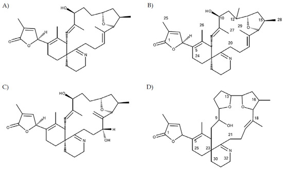 Structures of: (A) gymnodimine A; (B) 12-Methyl-gymnodimine A; (C) gymnodimine C and (D) gymnodimine D.