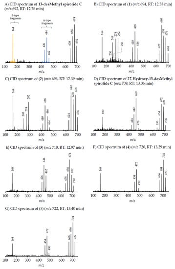 Collision-induced (CID) spectra of all determined spirolides: (A) 13-desMethyl-spirolide C; (B) compound (1); (C) compound (2); (D) 27-Hydroxy-13-desMethyl-spirolide C; (E) compound (3); (F) compound (4) and (G) compound (5).