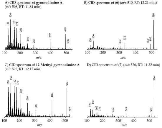 CID spectra of all determined gymnodimines: (A) gymnodimine A; (B) compound (6); (C) 12-Methyl-gymnodimine A and (D) compound (7).