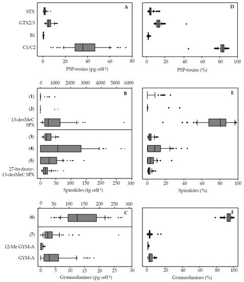Box–Wisker Plots for absolute (A–C) and relative values (D–F) of PST, spirolides and gymnodimines.