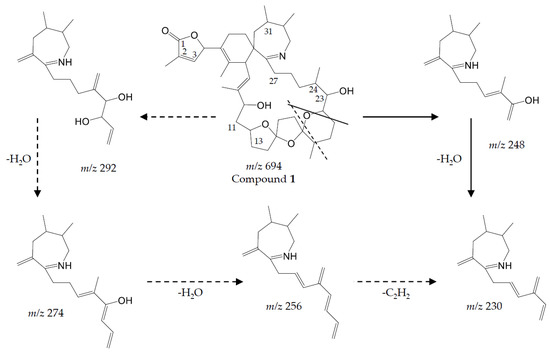 Compound (1) with a molecular formula C41H60O8N presents one methylene less and one oxygen more than 13-desMethyl-spirolide C (C42H62O7N). Its CID spectrum displays a molecular ion cluster that shows four subsequent water losses, whereas the CID spectrum of 13-desMethyl-spirolide C only shows three water losses (Figure 2A,B). This confirms the presence of an additional hydroxyl group in (1). Moreover, in contrast to 13-desMethyl-spirolide C, the A-type fragment cluster of (1) was down-shifted of 16 Da (Figure 2A,B), which clearly indicated that the additional hydroxyl group must be in the C1 to C11 part of the molecule (Figure 5). On the other hand, the spectrum of (1) showed an additional cluster including ions at m/z 230, 248, 256, 274 and 292 (Figure 2B) that is typically not observed in CID spectra of SPX. This unusual formation of the m/z 248 fragment can be explained by the typical SPX ether ring cleavage (solid line in Figure 5) including an additional hydroxyl group at the C22–C27 part of the structure. However, in contrast to 27-Hydroxy-13-desMethyl-spirolide C, (1) does not produce a m/z 180 fragment and 27-Hydroxy-13-desMethyl-spirolide C does not produce the above-mentioned atypical ion cluster observed in (1) (Figure 2D) indicating that the hydroxylation cannot be at the C27 position. On the other hand, the fragments m/z 292, 274 and 256 can be explained by a modified cleavage of the ether ring (dashed lines in Figure 5). Such a modification requires a different chemistry in close vicinity of the ether ring, which argues for a hydroxylation at C22 or C23. In summary, interpretation of the CID fragments versus those of 13-desMethyl-spirolide C indicates the presence of a hydroxyl group between C1 and C11 and another one most likely at C23. The structure of (1) would thus be consistent with the structure of 11,23-diHydroxy-19-deHydroxy-13,19-didesMethyl-spirolide C.