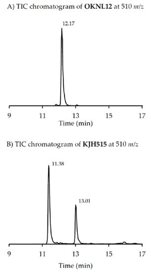 Total Ion Chromatograms (TIC) of A. ostenfeldii strains (A) OKNL12 and (B) KJH515.