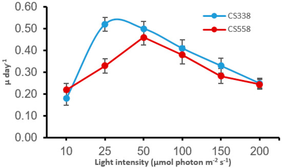 Effects of light intensity on specific growth rates (µ) of Microcystis aeruginosa strain CS338 and CS558. Red and blue symbols/lines are toxic and non-toxic strains respectively. Error bars represent the standard deviation of three replicates.