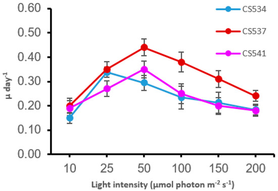 Effects of light intensity on specific growth rates (µ) of Anabaena circinalis strains CS534, CS537 and CS541. Red and purple symbols/line are toxic strains and blue is the non-toxic strain. Error bars represent the standard deviation of three replicates.