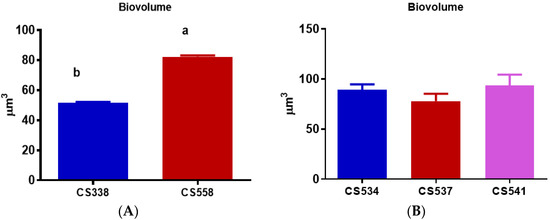 M. aeruginosa strains showed significant differences (t-test, p < 0.0001) in cell biovolume, with values almost 1.5 times higher in CS558 (toxic) compared to CS338 (non-toxic) strains (Figure 3A). On the other hand, strains of A. circinalis did not show any differences in biovolume (One-Way ANOVA: F2,6 = 2.806, p = 0.138) (Figure 3B).