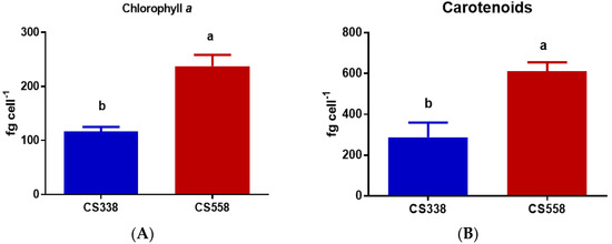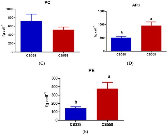 Cell concentrations of (A) chlorophyll a, (B) carotenoids, (C) phycocyanin, (D) allophycocyanin (APC), and (E) phycoerythrin (PE), in M. aeruginosa strains CS338 and CS558 growing in batch culture exposed at optimal light for growth. Samples were taken at exponential phase (day 5). Vertical bars indicate standard deviations of at least three replicates. Different letters above the bars indicate means that are significantly different at p < 0.05).