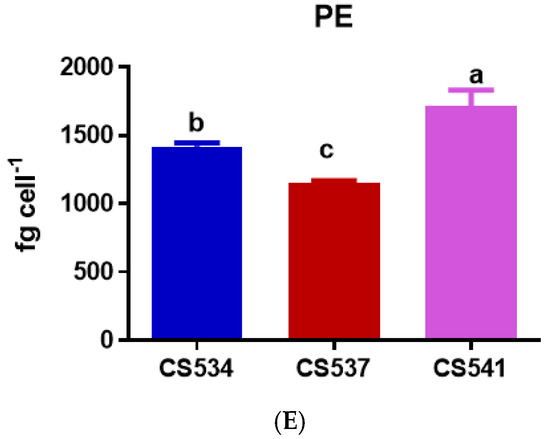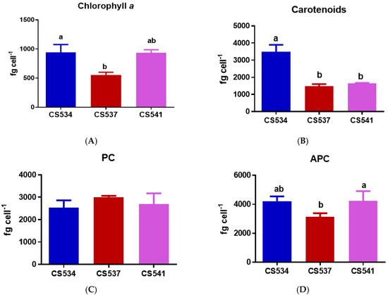 Cell concentrations of (A) chlorophyll a, (B) carotenoids, (C) phycocyanin, (D) allophycocyanin (APC), and (E) phycoerythrin (PE), in A. circinalis strains CS534, CS537 and CS541 growing in batch culture under optimal light for growth. Samples were taken at exponential phase (day 5). Vertical bars indicate standard deviations of at least three replicates. Different letters above the bars indicate means that are significantly different at p < 0.05).