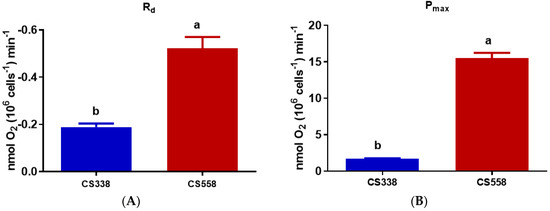 In case of M. aeruginosa, both Rd and Pmax (maximum photosynthetic rate) showed significant differences (Rd: t-test, p = 0.0037; Pmax: t-test, p = 0.0002) between strains (Figure 6A,B). Strain CS558 (toxic) showed lower Rd (0.522 nmol O2 106 cells−1 min−1) and higher Pmax (15.530 nmol O2 106 cells−1 min−1) values than strain CS338 (Rd, 1.887 nmol O2 106 cells−1 min−1, Pmax, 1.727 nmol O2 106 cells−1 min−1). These differences were not attributable to differences in biovolume as Rd and Pmax expressed on a per µm3 basis showed the same trend (data not shown).