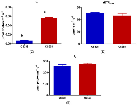 Comparison of dark respiration and photosynthesis in M. aeruginosa strains CS338 and CS558 growing in batch cultures at optimal light intensity. (A) dark respiration (Rd); (B) maximum photosynthetic rates (Pmax); (C) light harvesting efficiency (α); (D) relative electron transport rate (rEtrmax); (E) Light saturation parameter. Samples were taken at exponential phase (day 5). Error bars represent standard deviation of three replicates. Different letters above the bars indicate means that are significantly different at p < 0.05).