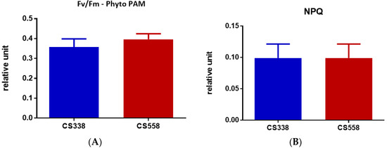 Comparison of both (A) maximum quantum yield (Fv/Fm) and (B) non-photochemical quenching (NPQ) of M. aeruginosa strains CS338 and CS558 growing in batch culture. Samples were taken at exponential phase (day 5). Error bars represent standard deviation of three replicates.