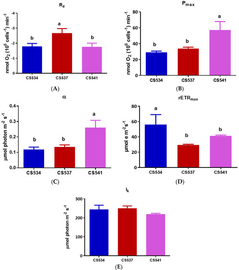 Comparison of both dark respiration and photosynthesis in A. circinalis strains CS534, CS537 and CS541 growing in batch culture exposed at the optimum light for growth. (A) dark respiration (Rd); (B) maximum photosynthetic rates (Pmax); (C) light harvesting efficiency (α); (D) relative electron transport rate (rETRmax); (E) light saturation parameter (Ik). Samples were taken at exponential phase (day 5). Error bars represent standard deviation of three replicates. Different letters above the bars indicate means that are significantly different at p < 0.05).
