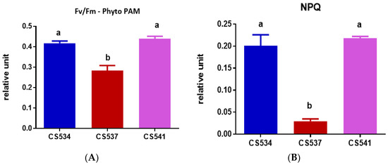 Comparison of both (A) maximum quantum yield (Fv/Fm) and (B) non-photochemical quenching (NPQ) of A. circinalis strains CS534, CS537 and CS541 growing in batch culture exposed at the optimum light intensity for growth. Samples were taken at exponential phase (day 5). Error bars represent standard deviation of three replicates. Different letters above the bars indicate means are significantly different at p < 0.05).