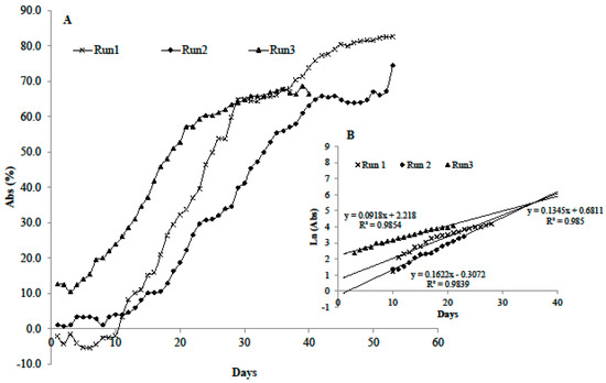 Growth curves obtained by transforming the on-line recorded light transmitted values in light absorbance (A). Linear portion of the natural log transformed data (B).