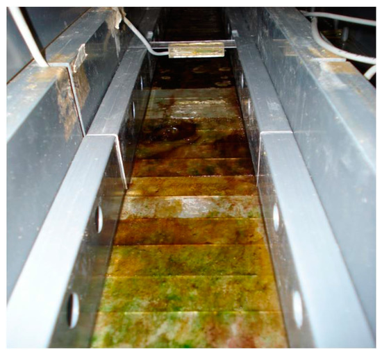 Microcosm lane with bottom slides colonised by biofilm. Coverage is patchy and differently pigmented portions are visible.