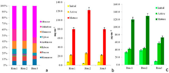 Biofilm capsular exopolysaccharides (CPS) monosaccharides in mature samples grown at each Run. Different proportions of 8 neutral sugars differed between Runs, data are expressed as mol % (a). Dry weight (b) and chlorophyll a content (c) values of biofilms at the three development phases, increasing trends over time were detected for both biomass indicators.