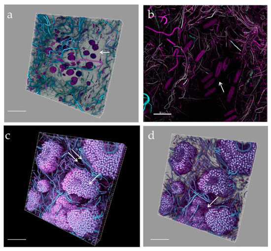 As the biofilm matured, so did its complexity with stratification and heterogeneous distribution of the organisms on substrata, resulting in the formation of voids and “valleys” (Figure 9 and Figure 10). Biofilm filamentous members, cyanobacteria and tube-dwelling diatoms, were mostly responsible of the layered structures observed (Figure 9c), while voids appeared especially around Amphidinium cf. carterae cell clusters, indicating exclusion of other biofilm members possibly due to the production of allelopathic compounds or mucous capsules around cell clusters (Figure 9c and Figure 10a) [23,41]. The ‘valley’ aspect was due to globular microcolonies of coccal cyanobacteria, evidencing active, multiple cell divisions (Figure 10c,d).