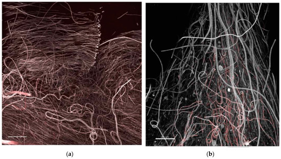 CLSM 3D recontructions of biofilm at mature phases showing layering of oriented, filamentous cyanobacteria (brighter autofluorescence at filament apex is possibly due to a light stimulus response) in (a) and occasional observation of loosely attached filamentous phototrophs or streamers, floating in flow direction (b), colour coded as in Figure 7. Bars = 40 µm.