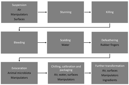 While muscles are sterile in healthy living birds, various microbiotas are hosted in the digestive tract, lungs, skin, feathers, etc. In slaughterhouses, the surfaces, air (aerosols), and liquids also encompass bacteria. Therefore, carcasses and cuts after animal killing can be contaminated by animal and slaughterhouse environment microbiota. Figure 1 summarizes the different steps in poultry slaughtering and the associated contamination routes. Although there are some differences between the practices in large-scale commercial slaughterhouses and small-scale slaughtering facilities, the main steps of poultry slaughtering are similar [14]. Compared to the slaughtering process of mammals, the main differences to be noted for poultry slaughtering are (i) the use of a water bath (hot or chilled) at different stages of the process; (ii) the feather removal step, which can be mechanical and is performed differently from removing the skin of mammals; (iii) the small size of birds (compared to cattle or sheep, for example) which has consequences on the ease of carcass manipulation and the mechanization of some processes.