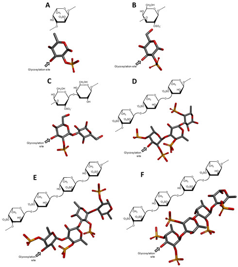 - Pomin, V.H.; Mourão, P.A.S. Specific sulfation and glycosylation—A Structural Combination for the Anticoagulation of Marine Carbohydrates. Front. Cell Infect. Microbiol. 2014, 6, 4–33. [Google Scholar] [CrossRef]
