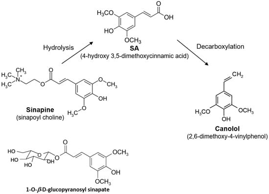 Rapeseed meal is particularly rich in phenolic compounds which account for 5 to 18 g/kg [,]. The major phenolic compound is sinapic acid (4-hydroxy-3,5-dimethoxycinnamic acid), which is essentially found in esterified forms (Figure 1). The esters of sinapic acid (SA), mainly sinapine (sinapoyl choline) and glucopyranosyl sinapate, represent 90–95% of all the phenolics while the amount of SA in the free form does not exceed 0.03–0.04% [].