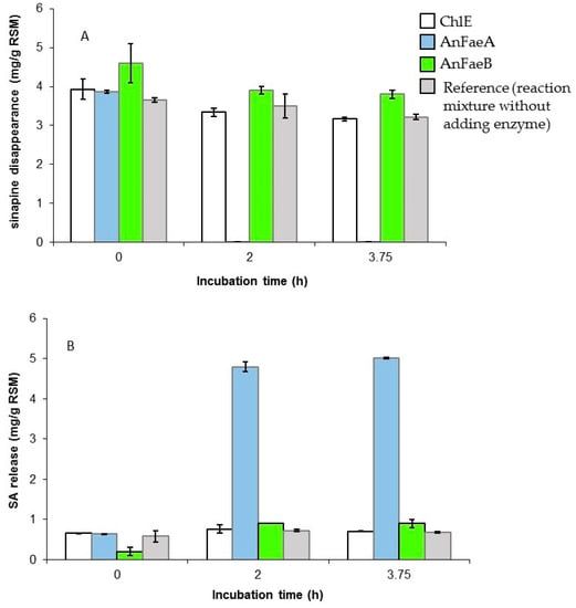 When grown in the presence of appropriate natural inducers, the strain A. niger BRFM281 has already been shown to produce feruloyl esterases able to release free hydroxycinnamic acids, including ferulic, p-coumaric and caffeic acids, from plant complex biomass such as cereal bran and sugar beet pulp []. In our study, the strain A. niger BRFM281 was grown in the presence of RSM as carbon source and enzyme inducer in the culture medium. AnFaeA, AnFaeB, and ChlE activities could be detected from day 3 to day 11 of cultivation on RSM, with maximal production of 0.67 nkat/mL AnFaeA, 0.44 nkat/mL AnFaeB and 0.29 nkat/mL ChlE on day 10, and SA was effectively released in the culture supernatant. However, SA was immediately converted into syringic acid (4-hydroxy-3,5-dimethoxybenzoic acid), certainly via a β-oxidation-type pathway as previously described for the conversion of ferulic acid into vanillic acid []. It is also noteworthy that no canolol could be detected in the culture medium of A. niger. Consequently, the release of free SA from RSM was further carried out by using the recombinant enzymes AnFaeA, AnFaeB and ChlE, formerly well-characterized in our laboratory [,,], instead of the fungus itself.