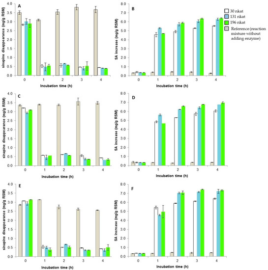 The moisture, fat and total phenolic contents of the RSM used in this study were of 10.0 ± 0.1% dry matter (DM), 1.2 ± 0.06% DM, and 19 ± 1.3 mg SAE/g DM, respectively. These data were consistent with the values available in the literature (for a review, see []). The sinapine and free SA content was determined after a methanolic extraction of the RSM phenolics and an alkaline hydrolysis, and was of 8 ± 0.53 mg/g DM (25.8 ± 1.7 µmol/g DM) and 0.49 ± 0.01 mg/g DM (2.2 ± 0.04 µmol/g DM) respectively. After alkaline hydrolysis, all the esterified forms of SA were hydrolyzed into a total of 9.77 ± 0.27 mg free SA/g DM (43.6 ± 1.2 µmol free SA/g DM). The latter value represented the total amount of the potentially releasable SA per gram of meal. It was used as the 100% reference for the calculations of enzymatic hydrolysis yields.